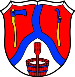 Blasonierung: „Durch eine blaue Wellendeichsel, oben rechts in Rot ein schwebendes blaues Beil mit goldenem Stiel, oben links in Rot ein schwebender blauer Forstsichelhaken mit goldenem Stiel, unten in Silber eine blaubereifte rote Bütte mit silbernem Inhalt, davor stehend ein rotes Rührsieb.“[6] |