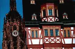 Die historische Frankfurter Altstadt galt bis zur weitgehenden Vernichtung im Zweiten Weltkrieg mit ihren rund 1250 größtenteils aus dem Mittelalter stammenden Fachwerkhäusern als eine der größten Fachwerkstädte Deutschlands.[1] Sie war zugleich einer der bedeutendsten Anziehungspunkte für Deutschlandtouristen. Die historische Altstadt wurde durch die Luftangriffe auf Frankfurt am Main 1944 weitgehend zerstört. Die Straßenzüge sowie der gesamte Stadtteil sind heute überwiegend von schnell und einfach errichteten Gebäuden der 1950er und -60er Jahre geprägt. Mehrere markante Gebäude und einige wichtige Stadtplätze wurden jedoch wiederhergestellt oder rekonstruiert, vor allem rund um den Hauptplatz, den Römerberg.