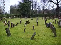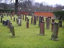 Die jüdische Gemeinde von Heddernheim besaß in der Nähe ihrer seit dem 16. Jahrhundert existierenden, um 1760 erneuerten Synagoge einen eigenen Friedhof (auf dem heutigen Gelände Alt Heddernheim 31–33). Die „Judenordnung“ von 1771 schrieb jedoch vor, dass Friedhöfe außerhalb des Ortes anzulegen waren. Dem folgte die Gemeinde aber erst 1843, als sie das Gelände in Alt Heddernheim verkaufen musste.[29] Der jüdische Friedhof Heddernheim besteht noch heute neben der Brücke der Straße In der Römerstadt über die Rosa-Luxemburg-Straße. Die letzte Beisetzung fand 1937 statt. „Er blieb während der Zeit des Nationalsozialismus vermutlich unangetastet. Durch Bombeneinwirkung entstanden während des Zweiten Weltkriegs an Mauern, Gräbern und Grabsteinen jedoch zahlreiche Schäden.“[30]