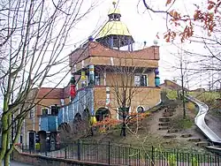 - Die Robert-Schumann-Schule in der Heddernheimer Kirchstraße 13 ist eine Grundschule mit Vorklasse, zuvor war sie Grund- und Hauptschule.[6] Sie hieß zunächst Heddernheimer Volksschule, seit dem 15. August 1961 ist sie nach dem Musiker Robert Schumann benannt.[7] Das Schulgebäude wurde 1880 mit zunächst vier Klassenräumen und zwei Lehrerwohnungen errichtet. Der Erweiterungsbau von 1898/99 wurde bereits 1904/05 aufgestockt.[8] 1913/14 war im Gebäude auch die erste Eingangsklasse der Ziehenschule untergebracht. 1945 wurde die Schule von zwei Bomben getroffen, wodurch Klassenräume beschädigt wurden und der Dachstuhl des Erweiterungsbaus verbrannte. Bereits Ende 1945 konnte der Unterrichtsbetrieb wieder aufgenommen werden.