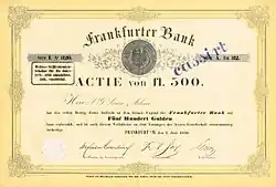 Daraufhin gewährte der Senat der Stadt Frankfurt am 11. April 1854 den Bankhäusern Grunelius & Co. und M. A. von Rothschild & Söhne, sowie der Frankfurter Vereinskasse eine entsprechende Konzession zur Gründung der Aktiengesellschaft Frankfurter Bank, später einfach Frankfurter Bank genannt.[3] Diese übernahm die Frankfurter Vereinskasse und deren Geschäftssitz in der Münzgasse 2 unmittelbar neben dem Frankfurter Rathaus, Römer genannt. Der Leiter der neuen Bank wurde Wilhelm Isaac Gillé (1805–1873), der schon Direktor der Frankfurter Vereinskasse gewesen war.[4] Peter Carl Grunelius, Mayer Carl von Rothschild, Philipp Christian Wilhelm Donner, Jacob Rigaud und Jacob Carl de Bary bildeten das erste Bank-Comité (Aufsichtsrat). Im Rahmen des Börsengangs wurden 20.000 Aktien à 500 Gulden ausgegeben, das Gründungskapital betrug damit 10 Millionen Gulden.[5] Die Aktienemission wurde vielfach überzeichnet.[6]