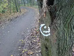 Darüber hinaus wird der Grüngürtel von den überregionalen beziehungsweise internationalen Wanderwegen Bonifatius-Route, Jakobsweg, Frankfurter Elisabethpfad,[38] Hölderlinpfad und vom Europäischen Fernwanderweg E1 durchquert. Der Grüngürtel-Rundwanderweg hat außerdem an mehreren Stellen ausgeschilderte Übergänge zur Wanderroute des Regionalparks Rhein-Main.[26]