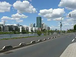Straße am Mainufer mit Frankfurter Hüten als Trennung zwischen Fahrbahn und Geh- und Radweg