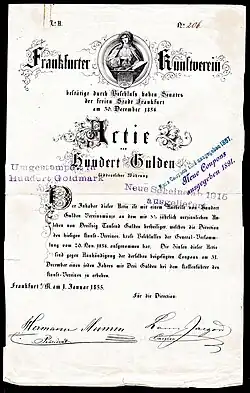 Da die Finanzkraft des Frankfurter Kunstvereins eingeschränkt war, wurde er 1855 aufgelöst. An seine Stelle trat die neu gegründete Aktiengesellschaft „Frankfurter Kunstverein“.[1]