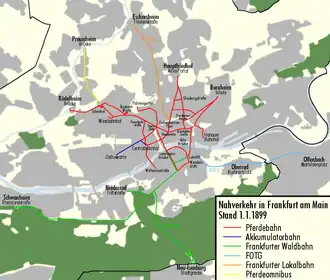 - ↑ Historische Stadt- und Verkehrsnetzpläne ( des vom 13. Juli 2020 im Internet Archive) Info: Der Archivlink wurde automatisch eingesetzt und noch nicht geprüft. Bitte prüfe Original- und Archivlink gemäß Anleitung und entferne dann diesen Hinweis. auf der Website tramfan-ffm.de, abgerufen am 11. Juli 2020