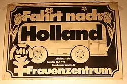 Aktionen und Demonstrationen erfolgten bezüglich der Streichung von § 218. Nachdem das Bundesverfassungsgericht am 25. Februar 1975 in einem Mehrheitsbeschluss die Fristenlösung als unvereinbar mit dem Grundgesetz beurteilte, kam es bundesweit zu Protesten von Frauengruppen. Das Frankfurter Frauenzentrum organisierte daraufhin mit öffentlicher Ankündigung ab Juni 1975 Fahrten nach Holland zu dort legalen Abtreibungsambulanzen. Die Busfahrten wurden etwa ein Jahr lang an Samstagen durchgeführt und von jeweils zwei Frauen aus dem Frauenzentrum begleitet.[34][35]