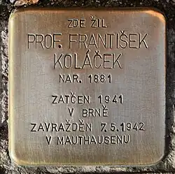 František Koláček (9. Dezember 1881 in Brünn – 7. Mai 1942 in Mauthausen) war ein tschechischer Geograph und Professor an der Masaryk-Universität, hier gründete er das Geographische Institut. Während der Besatzungszeit schloss er sich dem Widerstand der Brünner Hochschullehrer an, im Januar 1942 wurde er deswegen verhaftet und zum Tode verurteilt. Das Todesurteil wurde in Mauthausen vollstreckt.