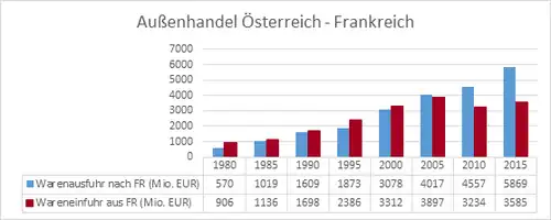 Während dabei bis um das Jahr 2000 der Wert der Importe französischer Waren nach Österreich typischerweise den Wert der Exporte nach Frankreich übertroffen hat, was einem Handelsbilanzdefizit aus österreichischer Sicht entspricht, ist zuletzt der Wert der Warenexporte nach Frankreich weit höher gelegen als jener der entsprechenden Importe. Dies ergibt sich daraus, dass die Warenimporte aus Frankreich nach Österreich seit 2000 auf einem ähnlichen Niveau schwanken, während die österreichischen Warenlieferungen nach Frankreich im selben Zeitraum massiv zugenommen haben und 2016 erstmals über 6 Milliarden Euro betragen dürften.[55]