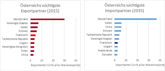- ↑ Die wichtigsten Handelspartner Österreichs 2015. Statistik Austria, 28. Oktober 2016, ehemals im (nicht mehr online verfügbar); abgerufen am 22. Dezember 2016. (Seite nicht mehr abrufbar. Suche in Webarchiven) Info: Der Link wurde automatisch als defekt markiert. Bitte prüfe den Link gemäß Anleitung und entferne dann diesen Hinweis.