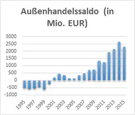 Der dementsprechende Handelsbilanzüberschuss auf Seiten Österreichs belief sich im Jahr 2015 in etwa auf 2.284 Millionen Euro, was für Österreich den zweitgrößten Handelsbilanzüberschuss mit einem anderen Land nach den USA und noch vor Großbritannien darstellt.[56]
