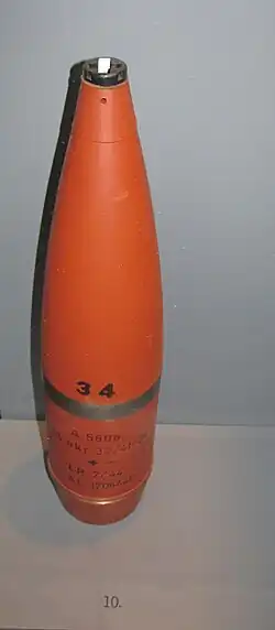 Die Flugbahn der 75-mm-Kanone war sehr flach, wodurch es zum Ricochettieren und hinter einer Deckung zur Wirkung kommen konnte.[note 1][4] Die Munitionsausstattung sah daher die Verwendung einer reduzierten Pulverladung vor, die eine viel stärker gekrümmte Schussbahn und dadurch kürzere Schussweite erlaubte (die durchschnittliche Kampfdistanz betrug 2500 m).[5] Die Kanoniere hatten mehrere Geschosse zur Auswahl: ein Schrapnell, eine Sprenggranate, eine Rauchgranate, eine Flugabwehrgranate mit Verzögerungszünder, eine Brandgranate, eine Leuchtgranate und eine Tränengasgranate.