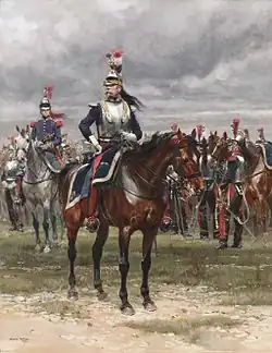 Im Oktober 1870 wurde die Kaiserliche Garde von Napoléon III aufgelöst und deren sechs Kavallerieregimenter umbenannt.[note 6] Die Ulanenregimenter (lanciers) wurden 1871 alle aufgelöst. Die Reste des 1. Regiments wurden in das „14e régiment de chasseurs à cheval“, die des 2. Regiments in das „10e régiment de hussards“, das 3., 4., 5., 6., 8. und 9. Regiment wurden zum „15e“, „16e“, „17e“, „18e“, „19e“ und „20e régiment de dragons“, das 7. bildete das „14e régiment de chasseurs à cheval“.[12] Nach der Niederlage im Deutsch-Französischen Krieg wurde das System der Marschregimenter zunächst aufgegeben. Die Kavallerie bestand jetzt noch aus 56 Regimentern im Mutterland und sieben in den nordafrikanischen Kolonien. Dabei handelte es sich insgesamt um 12 Kürassierregimenter, 20 Dragonerregimenter, 10 Husarenregimenter, 14 Regimenter Jäger zu Pferde, vier Regimenter Afrikanische Jäger und drei Regimenter Spahis. Dazu kam noch das Kavallerieregiment der Garde républicaine, welches der Gendarmerie nationale unterstellt war.