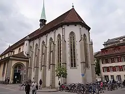 Die ehemalige Klosterkirche wurde in den letzten beiden Jahrzehnten des 13. Jahrhunderts von den seit 1269 in Bern ansässigen Dominikanern errichtet (diese wurden auch Prediger genannt – daher der alte Name Predigerkirche) und stand ursprünglich unter dem Patrozinium von Peter und Paul. Der zugleich mit der Kirche erbaute Lettner wurde 1495 mit Malereien aus dem Umkreis der Berner Nelkenmeister versehen. Nach der Einführung der Reformation wurden der Chor und das Altarhaus 1534 in ein Kornhaus umgewandelt. Der Chorraum wurde mit einer Mauer auf dem Lettner abgetrennt und auf der Lettnerempore wurde eine Orgel gebaut. 1753 erhielt die Kirche eine barocke Westfront. 1909–1912 wurde durch Architekt Karl Indermühle der Chor restauriert und gleichzeitig nordseitig in neubarockem Stil eine Sakristei angebaut. Zwischen dem Chor und dem durch die Lettnerwand abgetrennten Langhaus befindet sich ein Quergang mit den Zugängen zu den beiden Kirchenräumen. Auf der südlichen Abschlussmauer des Klosters befanden sich die vor 1520 entstandenen und 1660 beim Abbruch der Mauer zerstörten Fresken von Niklaus Manuels Totentanz.