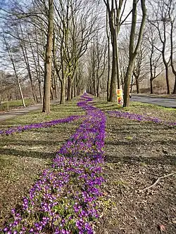 | Straße, Grünstreife mit Krokusse, Radweg | |