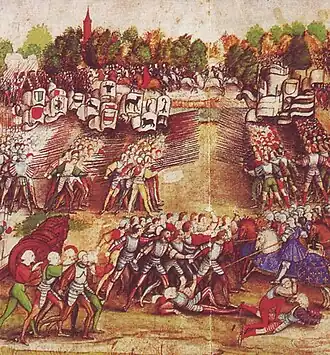 Gleich nach seiner Königssalbung am 25. Januar 1515[4] stand der junge König vor seiner ersten (kriegerischen) Herausforderung: Er hatte von seinem Vorgänger Ludwig XII. den Streit mit den Eidgenossen um das Herzogtum Mailand geerbt. Als Enkel der mailändischen Prinzessin Valentina Visconti erhob Ludwig XII. Anspruch auf das Herzogtum Mailand. Allerdings ging nach dem Aussterben der Visconti die Herrschaft im Herzogtum Mailand nicht auf den französischen König, sondern auf die Sforza über. Nach der kurzzeitigen Eroberung von Mailand verlor Ludwig XII. seinen italienischen Besitz in der Schlacht bei Novara. Franz I. verfolgte daher das Ziel der Rückgewinnung der italienischen Position.[5] Das Angebot von einer Million Kronen blieb ebenso erfolglos wie diplomatische Verhandlungen – ein bereits fertiger Vertrag wurde nur von den westlichen Schweizer Orten Bern, Freiburg und Solothurn sowie der Stadt Biel, nicht aber von den übrigen eidgenössischen Ständen anerkannt.[6] Daraufhin kam es am 13. September 1515 zur Schlacht bei Marignano, in der der junge König dank seines taktischen Geschicks, der überlegenen Feuerkraft seiner Artillerie und mithilfe des deutschen Landsknechtsregiments, der „schwarzen Garde“ unter Führung des Asche von Cramm, einen glänzenden Sieg errang. Mailand ging in französischen Besitz über, Frankreich galt als der militärisch stärkste Staat Europas. Der „ewige Frieden“ vom 29. November 1516 versprach Franz I. dauerhaften Zugriff auf das Söldnerpotenzial der Eidgenossenschaft.