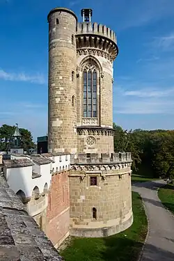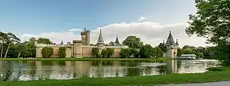 Die Burg und der umgebende Schlossteich sind eingebettet in einen rund 250 ha großen Schlosspark, der im späten 18. Jahrhundert im Stil englischer Landschaftsgärten gestaltet wurde. Darin befinden sich Wälder, Wiesen, mehrere Kanäle, ein Turnierplatz, der Concordiatempel und weitere Bauwerke wie die „Rittersäule“, eine Marmorbüste des Kaisers und das Lusthaus.