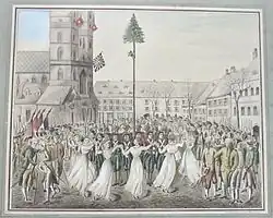 Als 1798 die Helvetische Revolution ausbrach, fuhr Franziska mit Dorothea und Regula nach Aarau. Sie muss die „vornehme Frau“ gewesen sein, welche dort am 1. Februar – dem Jahrestag ihrer Flucht aus Wien – „mit einem Säbel umgürtet, in weissen Kleidern, wie mehrere vornehme Frauenzimmer, alle mit Nationalbändern geziert, mit fränkischen (französischen), deutschen und schweizerischen Patrioten“ um den Freiheitsbaum tanzte.[13] Sie tat dies wohl unter dem Einfluss ihres Gastgebers, des Seidenbandfabrikanten und späteren Senators der Helvetischen Republik Johann Rudolf Meyer (1739–1813). Dass ihr Verwalter Johann Kaspar Fischer dem Berner Landvogt auf Kasteln schrieb, sie habe an der „hässigen Scene“ teilnehmen müssen, sagt wohl mehr über die Einstellung von Absender und Empfänger des Briefes zur Revolution aus als über jene Franziskas.[14]