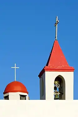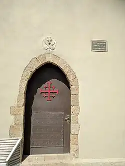 Die Kirche hat drei Eingänge, einen von der südlichen Stadtmauer her und ins dritte Joch zwei, jeweils einen von Westen und Osten, wo Treppen vom niedrigeren Niveau der nördlichen Gasse Schariʿ Ṣālaḥ wa-Baṣrī (شارع صالح وبصري, DMG Šāriʿ Ṣālaḥ wa-Baṣrī, רְחוֹב צָאלַח וּבַצְרי Rechōv Zālach ū-Vazrī) heraufführen. Das Kreuzgewölbe im dritten Joch weist am Scheitel eine runde Öffnung auf, worüber sich eine rot gekuppelte Laterne erhebt, durch die bei Tage Licht hereinfällt. Außen etwa mittig auf der Ostmauer setzt ein gemauertes Glockentürmchen mit unverkleideten Schallöffnungen auf.