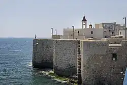 Im Rahmen der Pläne zur Wiederbelebung der Altstadt begann die Kostodie des Heiligen Landes 1947 die Franziskanerkirche zu renovieren,[2][32] jedoch ruhten die Arbeiten ab November im Palästinensischen Bürgerkrieg. Schließlich beschädigten im Mai 1948 israelische Geschosse im Krieg um Israels Unabhängigkeit den exponiert gelegenen Bau, bevor der ZaHa"L am 17. Mai 1948 die Stadt einnahm.[33] Während jüdische Akkoner alle vor antisemitischer Gewalt im Zuge des Arabischen Aufstands 1936 bis 1939 aus der Stadt geflüchtet waren,[34] floh im Krieg um Israels Unabhängigkeit die Hälfte der nichtjüdischen Akkoner[34][35] oder wurde vertrieben.[36] Zugleich wurde Akko erste Zuflucht und dann neue Heimat vieler arabisch-muslimischer Binnenflüchtlinge aus anderen Orten,[37] die landesweit mit 46.000 Personen 1949 ein knappes Drittel der israelischen Araber ausmachten.[38]