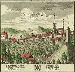 - ↑ a b Friedrich Bernhard Werner: Scenographia Urbium Silesiae. Tab. V. Vorstellung der Prospecte von den vornehmsten Staedten der Fürstenth. Liegnitz u. Teschen im Herzogth. Schlesien, entworfen von F. B. Werner, u. herausgegeben von Homaennischen Erben, Nürnberg A: 1738 Biblioteka Narodowa/Nationalbibliothek, Warschau, Polen