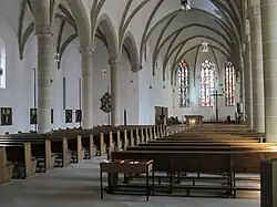 Insgesamt bildet das Kircheninnere eine breit angelegte Halle. Das Langhaus hat dabei sechs Joche, der Chor drei. Er schließt im 5/8-Schluss. Der Raumeindruck wird von dem breiten Mittelschiff dominiert. Der etwas erhöht liegende Chor nimmt die Maße des Mittelschiffes auf. Pfeiler, Kämpfer und Gewölbe wurden bei der Rekonstruktion unter genauer Wiederholung der Originalformen in Beton gegossen. In der linken Wand sind zwei Schlusssteine der alten Sakristei eingemauert. Im Mittelschiff liegen die weiten Kreuzrippengewölbe höher als in den Seitenschiffen. Die schmalen Rippen sitzen zum Mittelschiff hin auf achteckigen Kämpferplatten und an den Außenmauern auf einfachen Blattkonsolen auf. In Entsprechung zu den zerstörten Vorbildern sind die Gewölbescheitel zurückhaltend farbig gefasst.