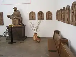 Die große Madonna im Rosenkranz, die nach einer Arbeit Tilman Riemenschneiders im Würzburger Diözesanmuseum gefertigt wurde, stammt aus dem Jahr 1985.