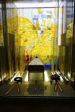 Der Kubus ist an der Innenseite zum Kirchenraum hin geöffnet. Auf seiner unteren Glasplatte befindet sich ein kleinerer Glaswürfel, auf dem der Reliquienschrein mit den Gebeinen des Seligen steht. Er besteht aus einem silbernen Metallkubus mit pyramidenförmigem Dach mit der Inschrift Beatus Ladislaus und den Lebensdaten des Seligen. Links und rechts des Schreins sind je drei unterschiedlich hohe und tiefe vertikale Glasplatten vorhanden. Die hinter dem Schrein liegende Rückseite des Würfels ist mehrfärbig gestaltet: Über einer gelb-orange-farbenen wolkenartigen Formation gibt es vor einem hellblauen Hintergrund ein Bildnis des Seligen in dünkleren Blautönen. Ein in der Wolkenformation angedeuteter Pelikan ist ein Bezug zum Wappen der Batthyány, und die Farben Gelb und Blau spiegeln jene der Wappen- und Flaggenfarben der Familie Batthyány und der Stadt Güssing wider. Zusätzlich sollen die goldgelben Töne der Glasplatten als Metapher für das Göttliche und Transzendente stehen.[69]