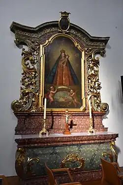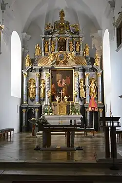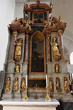 Das aktuelle blau-graue Farbschema des Hochaltares ist das Ergebnis einer Umgestaltung des Jahres 1956, bei der die zweite Fassung des Altares wiederhergestellt wurde. Ursprünglich war er im 17. Jahrhundert schwarz-gold gestaltet, in der Mitte des 18. Jahrhunderts blau-grau-marmoriert, danach ocker-braun.[51] Mit den beiden Altarbildern Mariä Heimsuchung und Mariä Himmelfahrt, sowie der Marienskulptur an seiner Spitze werden am Altar drei verschiedene marianische Themen dargestellt.[52]