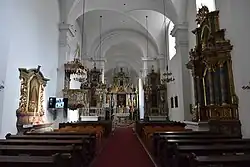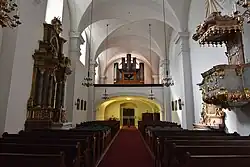 Der Großteil der Inneneinrichtung der Basilika stammt aus dem 17. und 18. Jahrhundert, der Kirchenraum und seine Ausstattung wurden aber mehrfach umgestaltet (siehe Geschichte). Wie die Außenfassade sind auch die Wände des Innenraumes – mit Ausnahme der Altäre – relativ schmucklos gestaltet.[45][46]