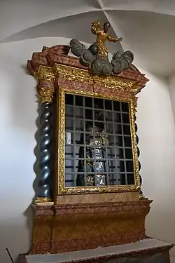 Die Sakristei besitzt eine kunsthistorisch wertvolle Monstranz aus dem Jahr 1517, die von der Witwe und der Tochter Willhelm Baumkirchers – dem Sohn von Andreas Baumkircher – gestiftet worden sein soll. Sie besteht aus einem Gehäuse in der Form eines gotischen Turmes mit seitlich anschließenden kleineren Türmen mit Baldachin, in denen sich Heiligenfigürchen befinden. Die Monstranz wird hauptsächlich im Kloster aufbewahrt, gehört aber zur liturgischen Ausstattung der Klosterkirche und ihrer Sakristei.[65][66]