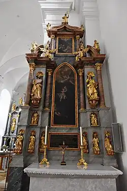 Der 1649 ausgeführte barocke Hochaltar wurde laut Urkunde vom Bildhauer Matthäus Kern († 1660) und vom Maler Wolfgang Resch († 1658) aus Graz geschaffen – möglicherweise nach einem Entwurf von Philiberto Lucchese. Während die genauen Arbeiten Kerns durch Abrechnungen aus den Jahren 1647 bis 1653 belegt sind, ist bei Resch unklar ob die gesamte farbige Fassung des Altares von ihm stammt, oder nur das Altarblatt.[47][48]