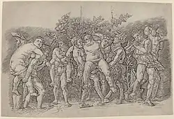 Dürers Zeichnungen zeigen eine andere Art, die italienische Renaissance aufzunehmen. Der androzentrische Kern humanistischer Kultur spiegelt sich in seinen sinnlichen männlichen Akten wider, lieferte aber auch eine „weibliche Groteske“ – erstmals in seiner Federzeichnung Frauenbad: Ein junges Bademädchen sitzt neben einer Frau, deren gedrungener Körper vom Altern so entstellt ist, dass er nicht nur von der weiblichen Schönheit, sondern auch von der Geschlechtsidentität selbst abweicht. Die Ältere trägt einen Männerhut, und die Wasserhähne direkt neben ihr erinnern an die Anspielung auf männliche Genitalien aus Dürers Holzschnitt Männerbad, was ihre Ausgrenzung aus der Geschlechternorm noch mehr unterstreicht.[5] Während die Forschung in den jüngeren Frauen antike Venustypen erkennt, kann die „korpulente Matrone“ weder antiken noch akademischen Vorbildern zugewiesen werden; vielmehr geht sie auf einen Mantegna-Kupferstich (Bacchanal mit Silen) zurück.[6] Spielen die Wasserhähne wie im Männerbad auf das membrum virile an, würde dies bei der Nase der dicken Frau zu einem unanständigen Scherz führen, da ein Wasserhahn nahezu ihr Gesicht berührt.[1] Die zentrale, geheimnisvolle Schöne erinnert entfernt an den antiken Typus der hockenden Venus. Die junge Frau im Hintergrund, die mit zur linken Brust geführter Hand nach oben zur Zimmerdecke schaut, lässt an den Typus der schamhaften Venus pudica denken, während bei dem sich kämmenden Mädchen der Typus der Venus Anadyomene erkennbar ist. Die Frau mit den Zweigen und dem erhobenen Arm hingegen erinnert an den Typus der Venus Kallipygos. Neu ist am Frauenbad auch Dürers Ironie der Bilderzählung. Er hat sich eines klugen Schachzuges bedient, die erotische Botschaft zu dissimulieren.[1]