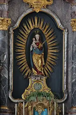 Den Hochaltar (um 1755) ziert eine spätgotische Marienfigur. Die Figuren der Seitenaltäre entstanden um 1877. Die Kanzel stammt aus der Erbauungszeit der Kirche. Das Deckengemälde stellt die Himmelfahrt Mariens dar.[1]