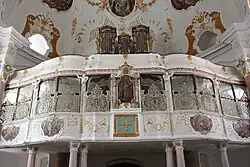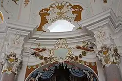 Der reiche Stuckdekor wird Dominikus Zimmermann, auf den wohl die Entwürfe zurückgehen, und Thomas Gering aus Günzburg zugeschrieben.