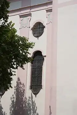 Die Außenmauern des Langhauses gliedern flache Pilaster mit Phantasiekapitellen. Darüber verläuft ein verkröpftes, schlichtes Gebälk, auf dem ein niedriges Attikageschoss sitzt. Das Langhaus wird von einem hohen Walmdach gedeckt und ist in fünf unterschiedlich breite Achsen unterteilt. Die mittlere und breiteste Achse springt leicht nach außen vor und unterscheidet sich durch ihre als Dreiergruppe angeordneten Fenster mit darüber liegendem Bassgeigenfenster. Die anderen, schmäleren Achsen sind jeweils von einem großen, oben und unten abgerundeten Fenster mit geschweift geohrtem Bogenschluss und einem ebenfalls geschweiften Rundfenster darüber durchbrochen. Sämtliche Gliederungselemente wie Sockel, Gesimse, Fensterumrahmungen und Pilaster heben sich durch ihre zartrosa Farbe ab.