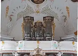 Eine 1756 angeschaffte Chororgel wurde 1782 wieder verkauft.[3] Das Innenwerk der Hauptorgel wurde im Jahr 1905 durch einen Neubau von Willibald Siemann aus München ersetzt. Siemann schuf im Jahr 1925 auch eine zweimanualige Chororgel mit sechs Registern.[4] Im Jahr 1998 schaffte die Gemeinde eine vierregistrige Truhenorgel der Orgelbauwerkstatt Rudolf Kubak an.