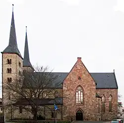Der älteste Teil der Kirche ist die Ende des 12. Jahrhunderts entstandene Westturmfront im romanischen Baustil. Das breite Turmwerk bildet eine mit gekuppelten Rundbogenfenstern versehene Halle. Darüber teilt es sich in zwei einzelne Türme mit je drei Stockwerken, ebenfalls mit gekuppelten Rundbogenfenstern mit unterschiedlich gemeißelten Kapitellen. Die Höhe beider Türme beträgt rund 46 Meter.[1]