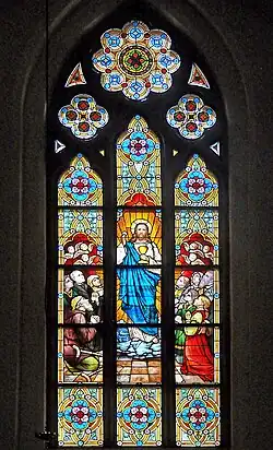 Die neugotische Kanzel ist im 19. Jahrhundert entstanden: in der Mitte Jesus, zu beiden Seiten die vier Evangelisten.
