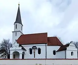 Die spätgotische Saalkirche wurde im 13. Jahrhundert erbaut und 1675 barock umgestaltet. Sie besteht aus dem Langhaus, dem eingezogenen Chor mit Fünfachtelschluss im Osten und dem mit einem spitzen Helm bedeckten Kirchturm im Westen, der erst 1883 anstelle eines Dachreiters errichtet wurde. Die Sakristei mit Schweifgiebel wurde 1765 im Südosten des Chors angebaut. Ein Vorbau mit Schweifgiebel an der Südwand des Langhauses führt zum Portal.