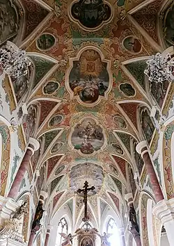 Das deutlich höhere Mittelschiff ohne Obergaden ist durch ein Tonnengewölbe mit Stichkappen auf ummantelten Pfeilern und Diensten, die Seitenschiffe durch Kreuzrippengewölbe geschlossen. Die Ausmalung erfolgte nach einer Inschrift über der Empore 1750 durch Johann Paul Kurz mit Szenen aus der Lauretanischen Litanei, der Heiligen Dreifaltigkeit und Marienverehrung; an den Obergadenwänden sind 14 Darstellungen aus Marienfesten, in den Seitenschiffen von je vier Frauengestalten aus dem Alten Testament zu finden.