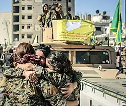 Das 2018 zu „Autonome Selbstverwaltung in Nord- und Ostsyrien“ umbenannte Gebiet Westkurdistan stellt einen Gegensatz dar zu den umliegenden politischen Systemen. Während der Kämpfe gegen den sogenannten Islamischen Staat (IS) im Bürgerkrieg in Syrien erregten vor allem die kurdischen Kämpferinnen von der YPJ weltweite mediale Aufmerksamkeit.[24] Als sie den IS vertrieben hatten, riefen sie in der Stadt Kobanê 2012 eine "Revolution" aus mit dem ernannten Ziel, eine gleichberechtigende Demokratie aufzubauen.[25] In einem Interview mit Deutschlandfunk Kultur erklärt die promovierte, kurdische Soziologin Dilar Dirik aus Oxford:
