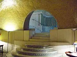 Der ausgeformte obere Abschluss der Vertäfelung verbreitert sich auf der Rückseite der Apsis zu einer Platte, von der aus sich ein schmalerer Rundbogen zu einer Flügeltreppe erstreckt, die in die darüberliegende Halle im nächsten Stock führt. Der Bogen rahmt ein spektakuläres Trompe-l’œil-Peristyl-Mosaik an der Rückwand der Flügeltreppe ein.[8]