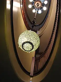 Eine vier Stockwerke hohe Treppe führt durch eine elliptische Öffnung in der Decke bis zu einem ebenfalls elliptischen Fenster im Dach des Hauses. Das noch 1903 dort aufgeführte Bleiglasfenster wurde zwischenzeitlich durch ein moderneres Klarglas ersetzt. Von einem Querbalken unter dem Fenster hängt über alle Stockwerke ein Kronleuchter aus Bronze herab, an dessen unterem Ende sich eine aus Glasmosaiken zusammengesetzte Kugel befindet.[7]