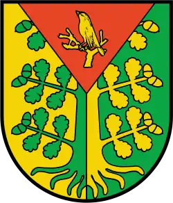 Blasonierung: „Im von Gold und Grün gespaltenen Schild eine bewurzelte, mit Blättern und Früchten versehene Eiche in verwechselten Farben, belegt mit einer roten gestürzten und gekürzten Spitze, darin in Gold ein Vogel auf einem Ast.“[14] |