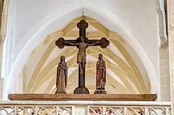 Die spätromanische Triumphkreuzgruppe im Triumphbogen des Chores war einst Teil des Lettners, der den Chor der romanischen Kirche vom Langhaus trennte. Sie besteht aus dem hoheitsvoll dargestellten Gekreuzigten, Maria und Johannes im Trauergestus und wird auf die Jahre um 1225 datiert. Maria steht auf einer Schlange, Johannes auf einem wolfshundähnlichen Untier, das an einem Apfel nagt. Es ist anzunehmen, dass damit auf den Sündenfall angespielt wird, der durch den Kreuzestod Jesu überwunden wurde. Wahrscheinlich gehörten ursprünglich noch weitere, nicht erhaltene Figuren dazu. Einige Reste der Lettnerskulpturen sind ebenfalls noch erhalten, die allerdings keine zuverlässige Rekonstruktion des Lettners erlauben.