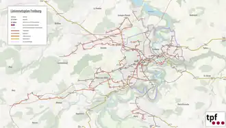 Das Stadtnetz umfasst drei Trolleybuslinien, sieben Autobuslinien und eine Standseilbahn (Wasserballastbahn). Neben der Stadt Freiburg werden auch die Agglomerationsgemeinden Villars-sur-Glâne, Marly, Granges-Paccot (Agy, Portes-de-Fribourg), Givisiez (Mont-Carmel, La Faye), Matran, Rosé, Corminboeuf und Chésopelloz von Stadtbussen bedient. Auf der Linie 1 können ausschliesslich Duo-Busse eingesetzt werden, die im Stadtzentrum elektrisch und auf den nichtelektrifizierten Aussenästen im Dieselbetrieb fahren.
