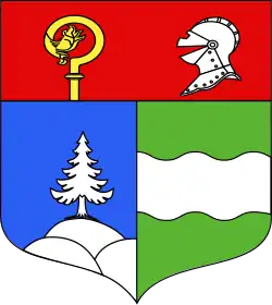 Das Wappen ist im Geviert mit Schildhaupt. Vorne zeigt es in Blau eine silberne Tanne auf silbernen Bergen (symbolisch für Wintersport und Forstwirtschaft), hinten in Grün einen silbernen Wellenbalken (symb. Viehweiden und Fluss). Im roten Schildhaupt stehen der goldene Abtstab (Augustinerkloster) und ein silberner offener Helm (Herren von Joux) nebeneinander. Die Teilungslinien und die Schildeinfassung sind goldfarben.[8]
