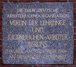 „In diesem Gebäude fand am 26./27. Oktober 1918 der Gründungskongress der Freien Sozialistischen Jugend statt. Karl Liebknecht sprach zu den Delegierten.“
