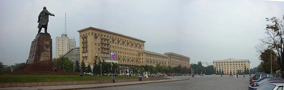 Am Übergang von dem runden zum rechtwinkligen Teil des Platzes stand das – am 5. November 1963 eingeweihte und insgesamt 20,2 m hohe – Lenindenkmal mit einer 8,5 m hohen Bronzeskulptur auf einem Sockel aus rotem Granit. Es galt als das höchste Lenindenkmal der Ukraine. Am Abend des 28. September 2014 wurde die Leninstatue auf dem Freiheitsplatz gestürzt.[5] Der Sockel wurde im August 2016 abgetragen.[6]