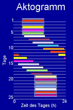 Im Aktogramm rechts wird eine circadiane Aktivität dargestellt. An den ersten 5 Tagen findet eine Synchronisation durch Licht statt. Nach Ausbleiben des Zeitgebers Licht ab Tag 6 beginnt der Freilauf: Die Aktivität beginnt jeden Tag etwas später. Die Freilauf-Periode (τ) ist bei diesem Beispiel länger als 24 Stunden, daher verschieben sich die Beginnzeiten auf der 24-Stunden-Skala nach rechts.